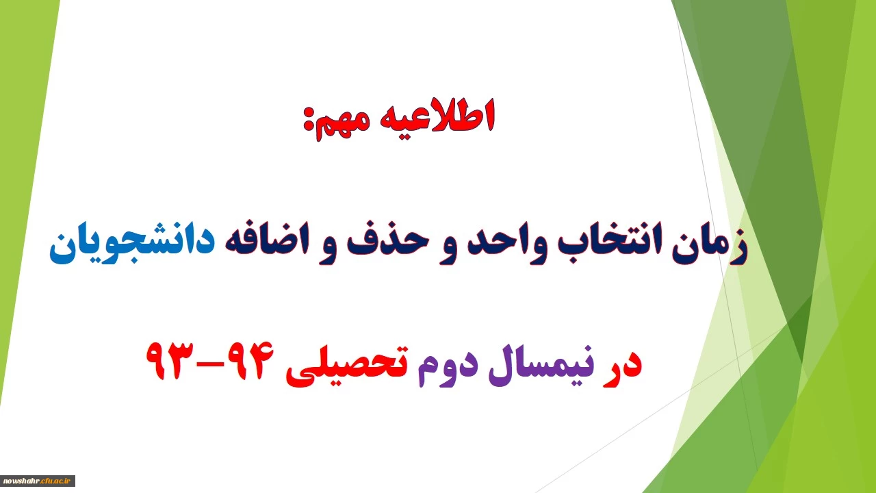 انتخاب واحد ترم دوم از 12 بهمن لغایت 17 بهمن ماه و زمان حذف و اضافه 27 بهمن لغایت 29 بهمن ماه می باشد.